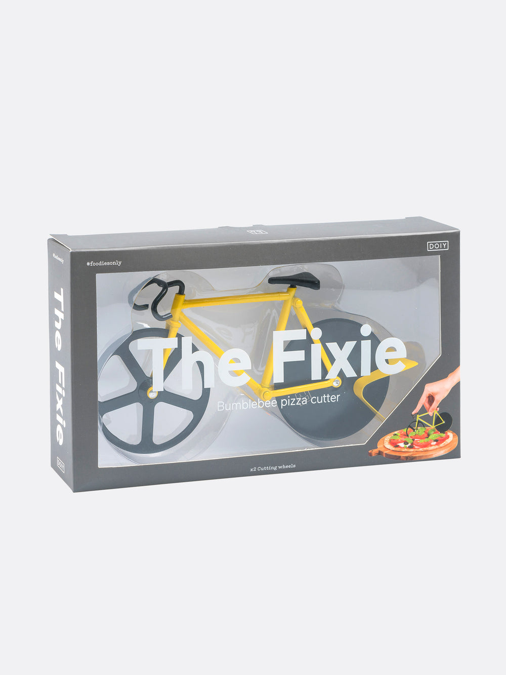 Unique pizza cutter shaped as a fancy fixie bike. Its double cutting wheels system makes it easy to slice your pizza. It includes a stand to convert this quirk object in a decorative piece in your kitchen. This model is inspired by the colours of bumblebees.