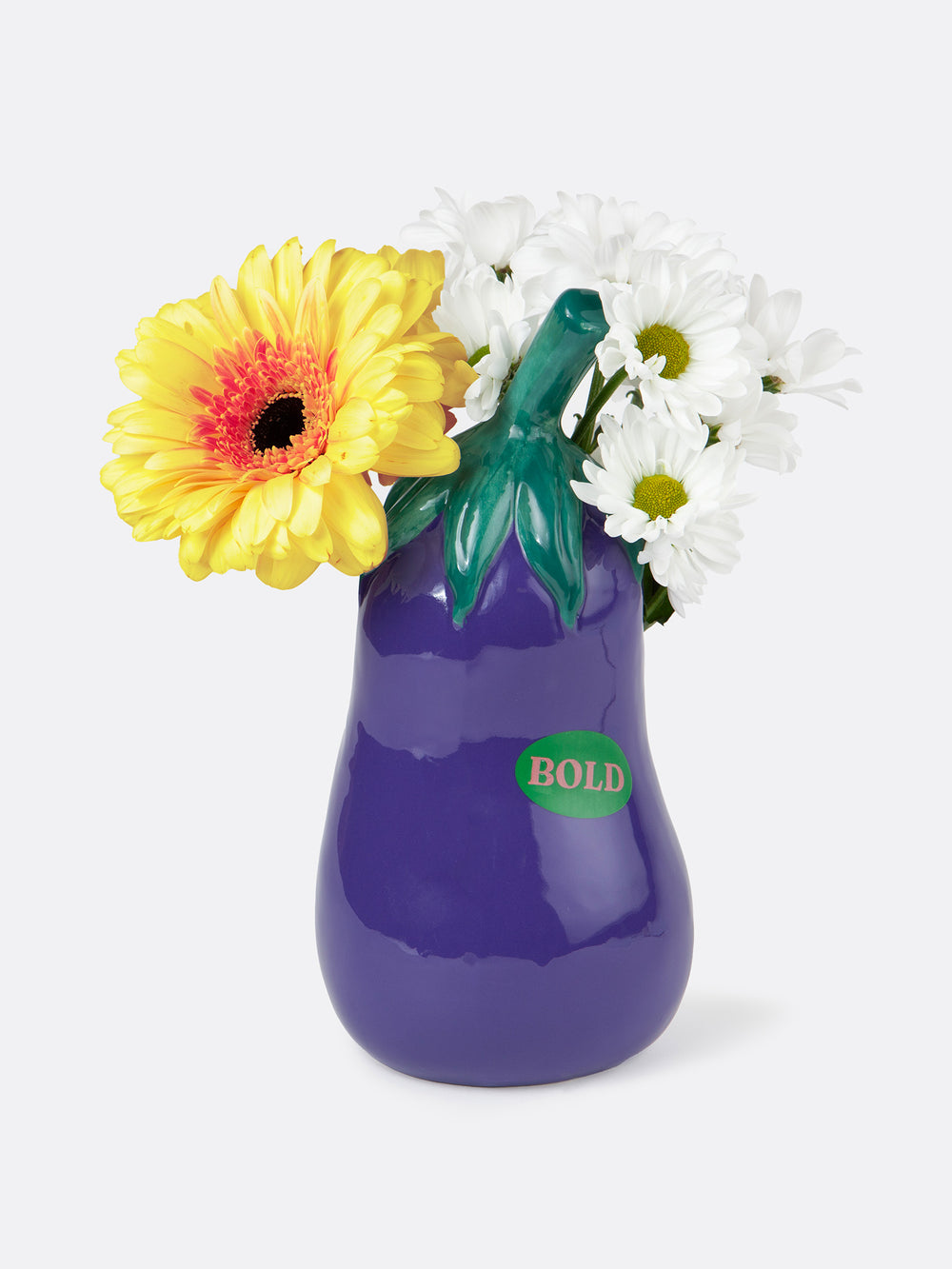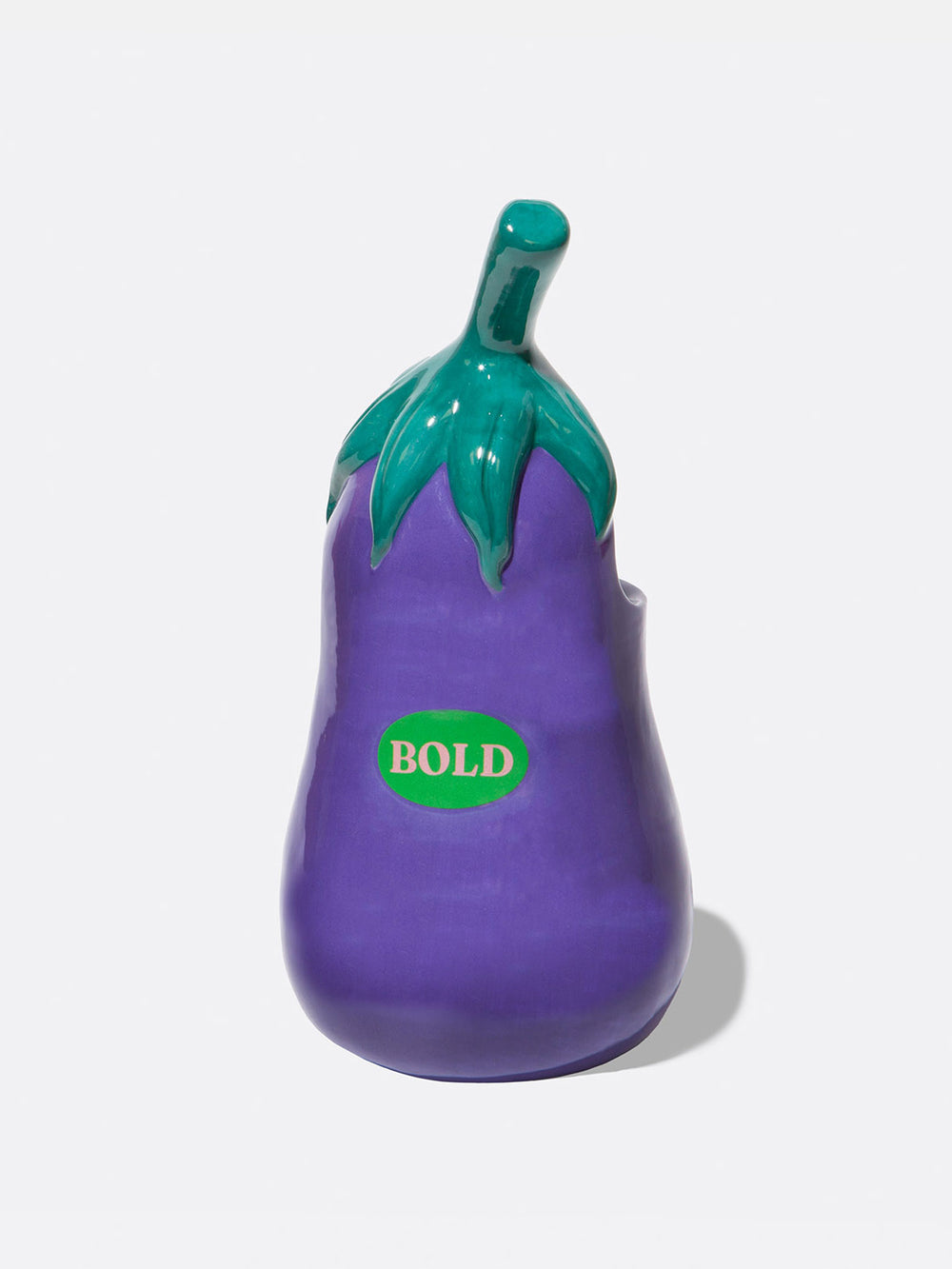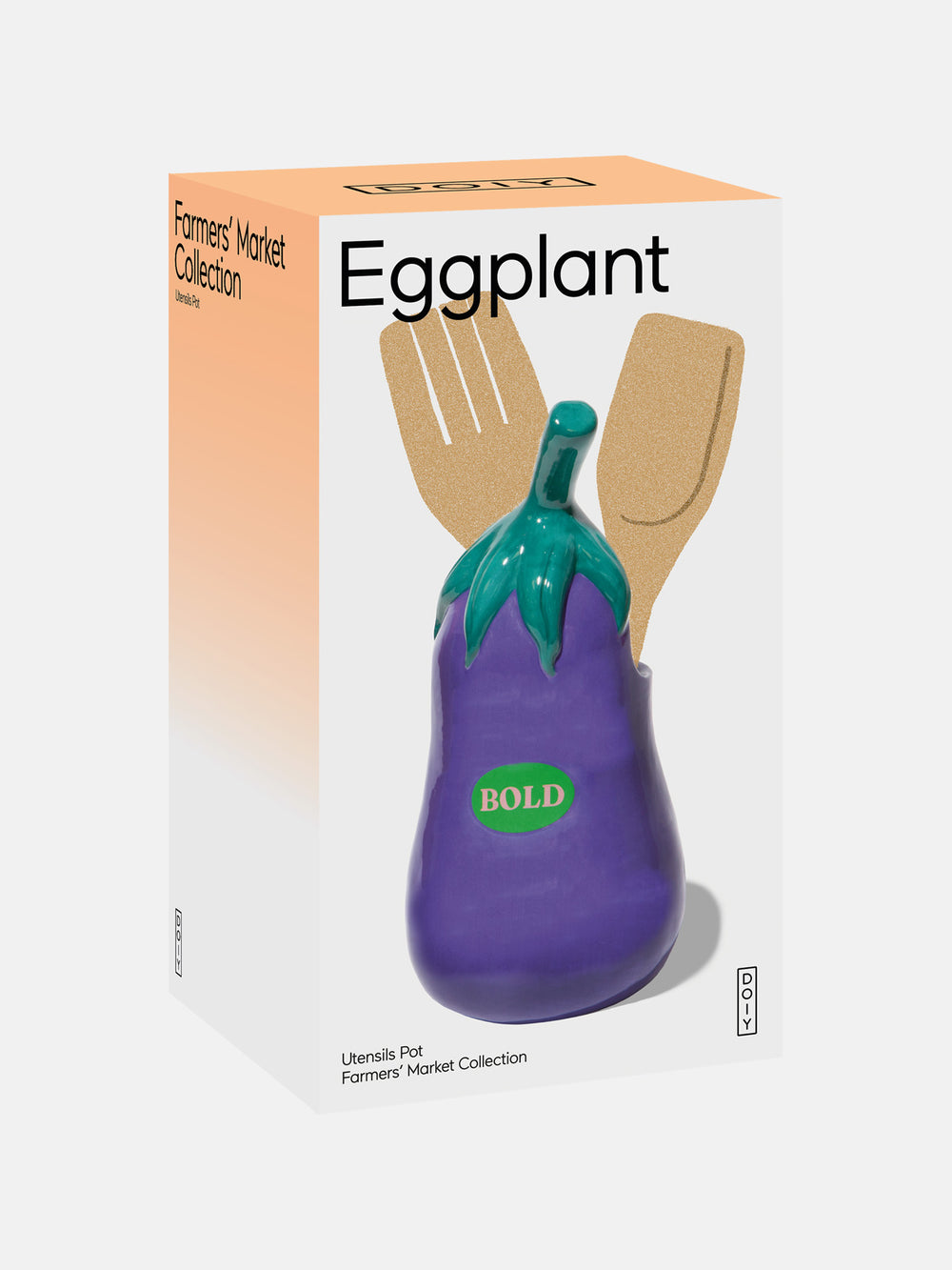 Un pot à ustensiles en céramique, en forme d'aubergine, dégage une allure vibrante et organique rappelant un marché fermier animé.