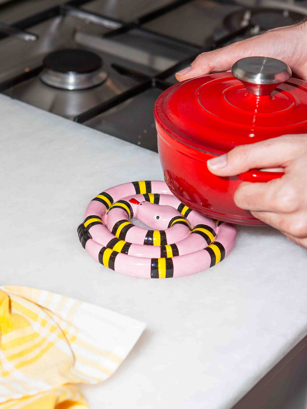 Protégez vos surfaces avec une touche serpentine. Ce dessous de plat rose en forme de serpent est audacieux, amusant et totalement inattendu.