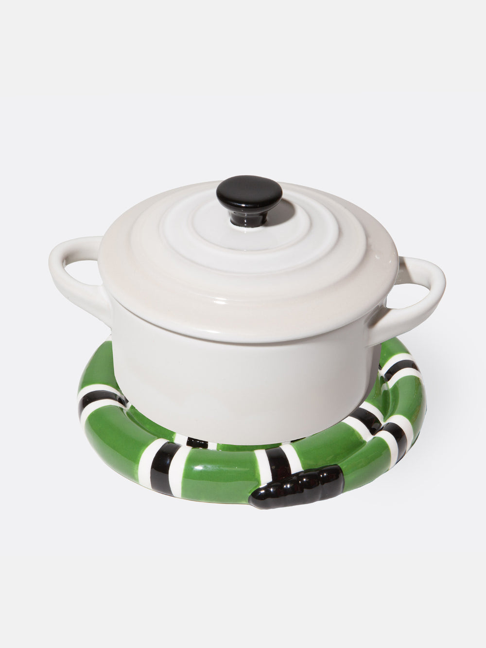 Protect your surfaces with a serpentine twist. This green snake trivet is bold, fun, and totally unexpected.